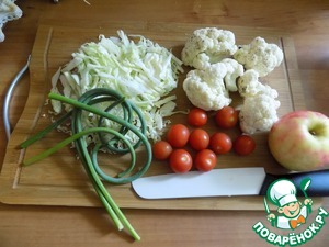 Готовим всё для основного блюда. Соцветия цветной капусты оставила крупными. Капусту белокочанную нашинковала длинной соломкой. Стрелки чеснока порезала примерно по 3 см. Яблоко-крупными дольками, серединку вырезала. Черри оставила целыми.