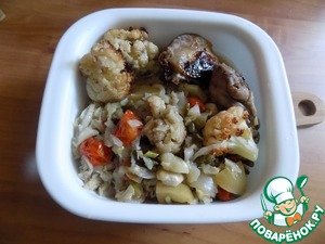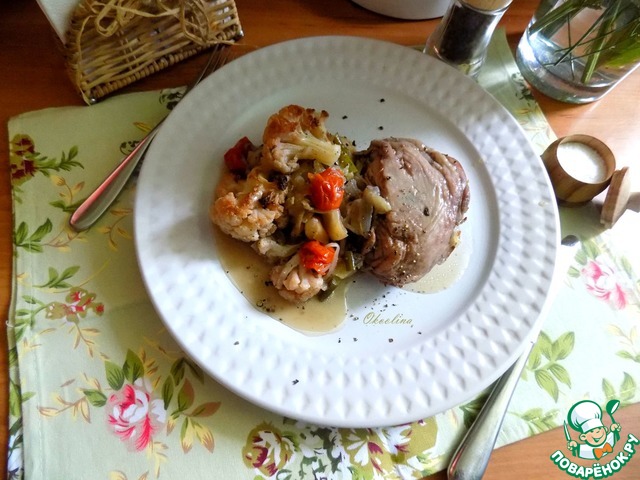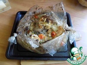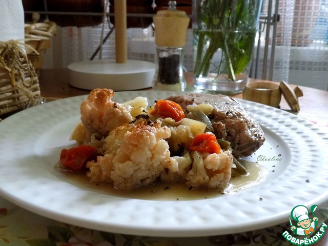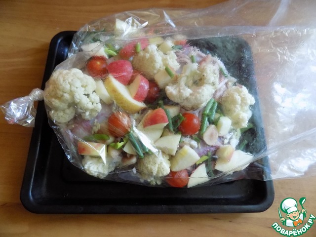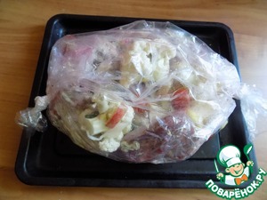 Вынула, разрезала рукав и посмотрела на готовность. Больше запекать мне не требовалось, всё отлично пропеклось и осталось целыми не разваленными кусочками (я об овощах, а именно о цветной капусте). Готово.
