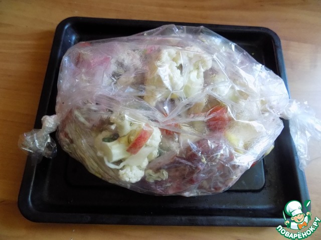 Поместила всё в рукав, туда же вылила маринад из под бёдер.