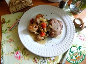 Блюдо с куриными бёдрами, замаринованными в гранатовом соке с чесноком и луком. Какое взять мясо не принципиально. Можно взять и говядину, и телятину, и постную свинину или индейку. Главное, что взяла для этого блюда 2 вида капусты: белокочанную молодую и цветную, чесночные стрелки свеженькие, крупное сладкое яблоко и черри. Запекла всё это в рукаве. Получилось очень вкусное, насыщенное и полезное блюдо совершенно без масла.