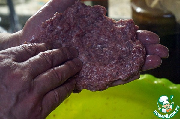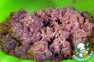 Приготовить фарш. Через мясорубку со средней решеткой пропустить говядину и свинину, посолить, поперчить, тщательно перемешать, накрыть пищевой пленкой, поместить в холодильник на несколько часов или на ночь.