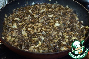 Выкладывать десертной или столовой ложкой начинку из папоротника с луком.