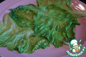 Для подачи вскипятить в кастрюльке воду, на 30 секунд окунуть туда листья салата – лучше порционно, из расчета 3 штуки на порцию. Вынуть, откинуть на дуршлаг, обсушить, разложить на блюде внахлест.