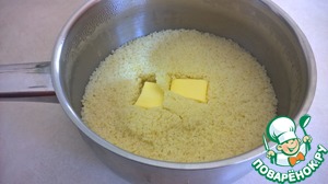 К этому времени кускус уже набух и готов. Добавляем в него оставшееся сливочное масло и закрываем обратно крышкой - чтобы масло растопилось. Потом взбиваем кускус вилкой или ложкой - так, чтобы растопленное масло равномерно распределилось.