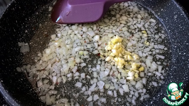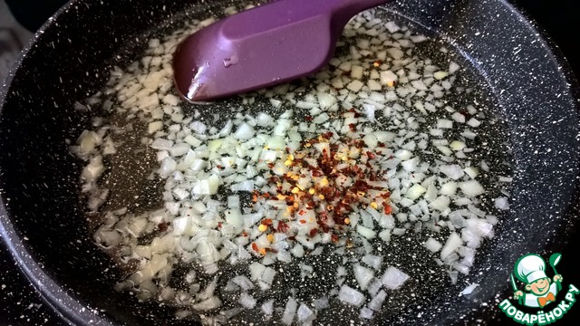 Пассеруем лук со жгучим перцем на оливковом масле (Extra Virgin). Лук не должен зажариваться, поэтому огонь должен быть средний. Это займет минут 5 - 7.