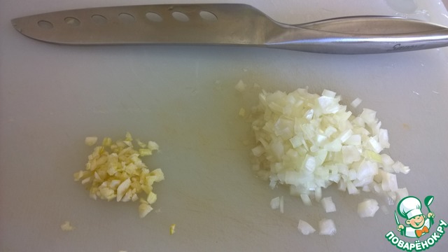 Лук нарезаем кубиком - 3 мм, чеснок мелко нарубаем