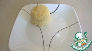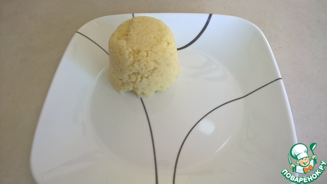 Затем прижимаем пустую тарелку к чашке и переворачиваем. Получается вот такой "куличик" из кускуса. Конечно можно и просто насыпать кускус, но так получается, на мой взгляд, интереснее.