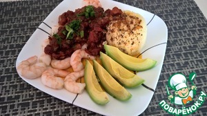 Затем выкладываем креветки, оставив пустым угол тарелки, поливаем их соусом. Немного соуса поливаем и на "куличик" из кускуса. Берем половину авокадо, разрезаем на дольки, снимаем кожуру и выкладываем в свободный угол тарелки. Можно украсить блюдо нарубленной зеленью по вкусу (подойдут зеленый лук, петрушка или кинза)