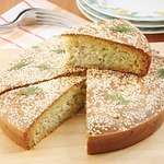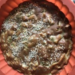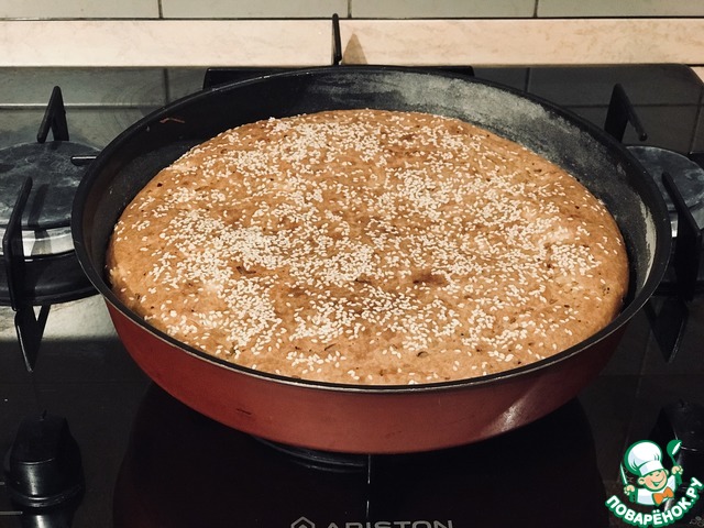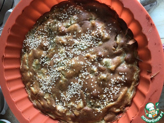 Сверху равномерно вылить оставшееся тесто. Разровнять лопаткой. Присыпать верх пирога кунжутом. (по желанию)