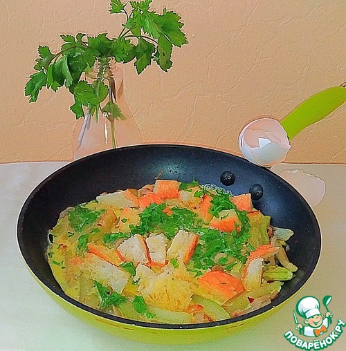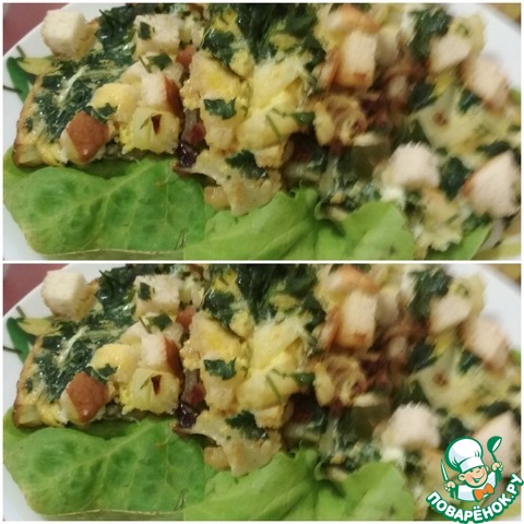 К овощам выложить наш обжаренный хлеб и залить яйцами. Огонь уменьшить, сковороду накрыть крышкой и оставить минуты на 3-4. Огонь отключить и наслаждаться вкусной яичницей.