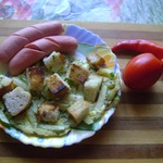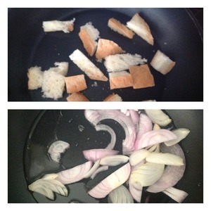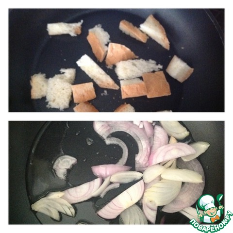 Хлеб нарезать небольшими кубиками и обжарить на сухой сковороде, но без фанатизма. Нам не нужны сухари, просто подсушить хлеб.