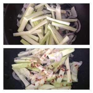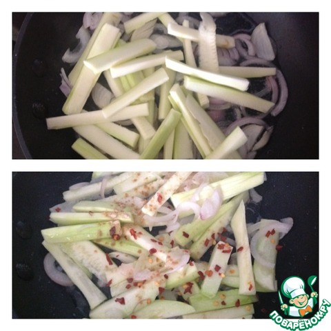 Молодой кабачок очистить и нарезать соломкой, выложить к луку, перемешать. Продолжать обжаривать овощи до готовности.