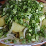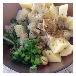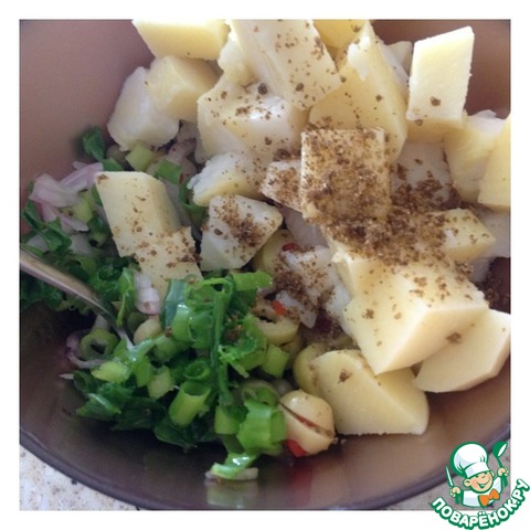 Картофель очистить и нарезать средним кубиком, зеленый лук мелко нашинковать.