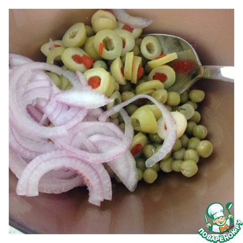 С горошка слить лишнюю жидкость и выложить 4 ст. л. в салатник. К горошку добавить лук, нарезанный полукольцами, и оливки, нарезанные колечками.