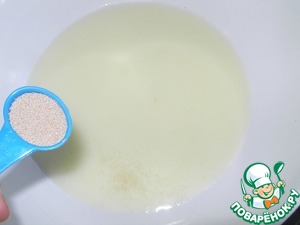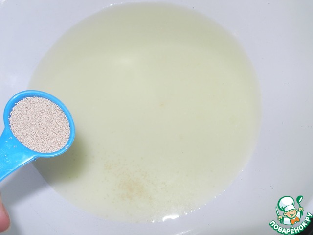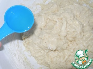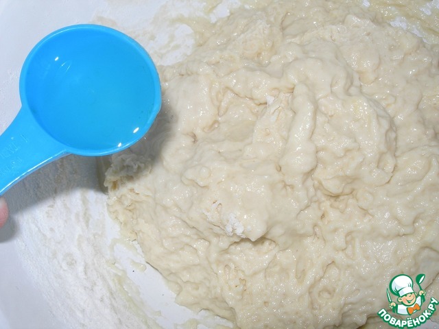 В тёплой простокваше растворяю 1 ч. л. сахара, 1 ч. л. соли и 1 ч. л. сухих дрожжей. Добавляю 2 яйца и просеянную муку - около 4,5 стаканов (может чуть больше или меньше муки, смотреть по консистенции теста). Замешиваю тесто.