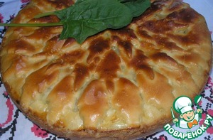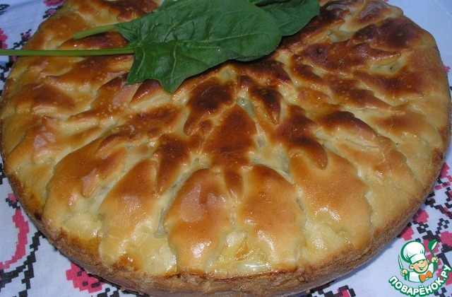 Теперь вторую часть теста также раскатать до необходимых размеров и аккуратно защипать края. Из оставшегося теста можно при желании сделать украшения на свой вкус. У меня вот такие листики, так как пирог со шпинатом, поэтому и решила украсить такими элементами. Дать расстояться пирогу минут 15, смазать взбитым яйцом и выпекать в заранее разогретой до 180 градусов духовке около 45 минут (ориентируясь на свою духовку и румяность пирога).