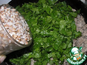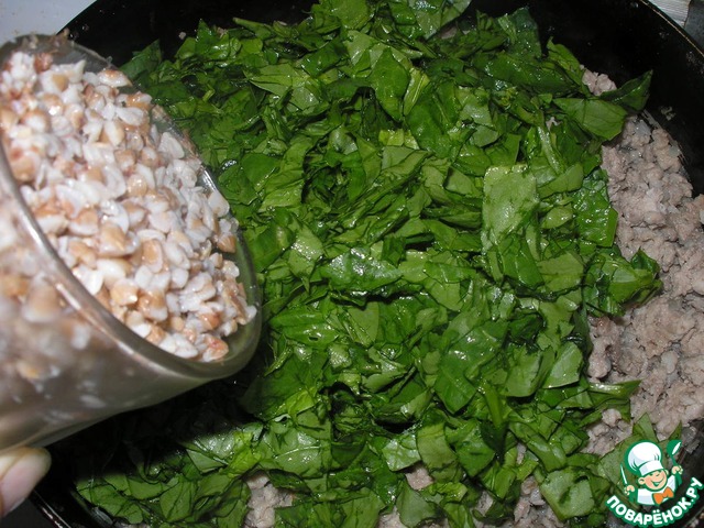 Как только фарш готов, можно добавлять к нему порезанный шпинат, сваренную заранее гречневую крупу и распаренный изюм. Тщательно всё перемешать и через минуту снять сковороду с огня. Приготовленную начинку посолить и поперчить по вкусу. Пока оставляю начинку остывать.