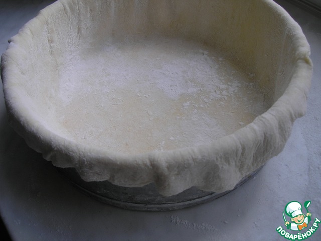 Беру первую часть и раскатываю его до тех размеров, какая будет форма. У меня разъёмная форма диаметром 24 см, высотой 7 см (но я буду делать не во всю высоту формы, а около 4,5-5 см в высоте). Раскатать тесто довольно тонко, около 7мм. Форму смазать растительным маслом и присыпать мукой. Аккуратно переложить тесто в форму, чтобы края теста выходили за края формочки. -