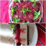 Уже через час сливочный слой как следует застыл. Готовим верх чизкейка - укладываем нарезанную клубнику и черешню.