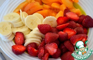 Банан нарезаем тонкими кружками, абрикосы - ломтиками, клубнику - пополам.