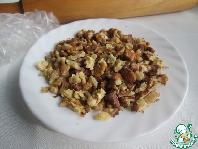Я их поместила в целлофановый пакет и прокатала несколько раз скалкой. Измельчила совсем немного, чтобы кусочки орехов чувствовались в варенье.