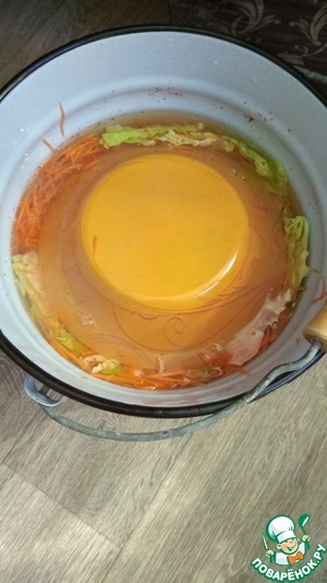 Накрываем тарелкой. Через 2 суток можно пробовать. На 3 сутки я раскладываю капусту по емкостям и убираю в холодильник. Подавать можно с маслицем ) Приятного)))