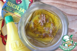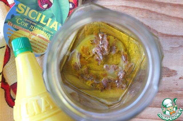 Для заправки в небольшую банку с крышкой, как советует Дж. Оливер, наливаем оливковое масло, мелко нарезанные анчоусы и лимонный сок SICILIA. Крышку закрываем и энергично взбалтываем. Заправка готова!