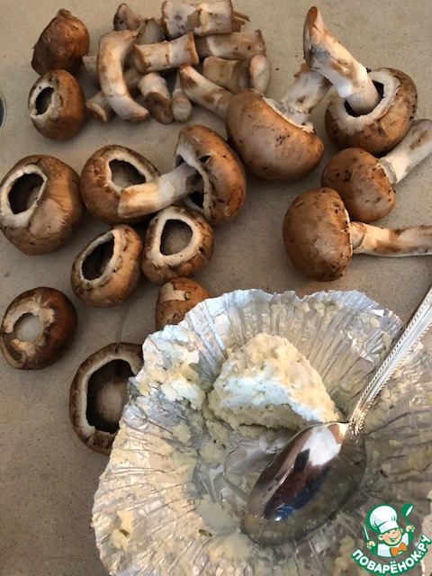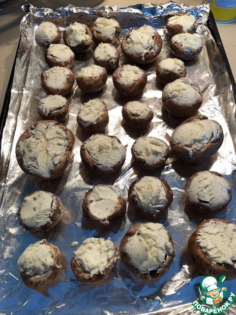 Набиваем шляпки сыром, в моем случае уже готовый с чесноком и шниит-луком. Складываем на противень и отправляем в разогретую духовку на 20-ть минут. Если вы не нашли творожный сыр с добавками, то вполне можно приготовить его самостоятельно. Возьмите ту зелень, которая вас привлекает в сочетании с сыром и либо мелко ее нарежьте и перемешайте с сыром вручную, либо используйте подходящий блендер. Мясорубка тоже сгодится.