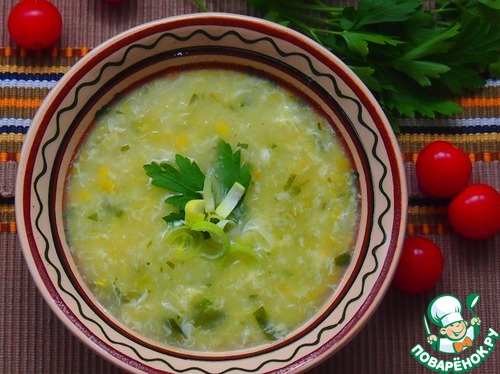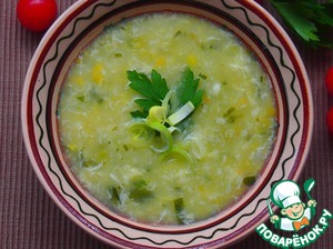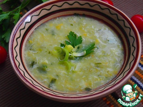Готовый суп посолить по вкусу, поперчить и, украсив листочками петрушки и колечками порея, можно подавать.