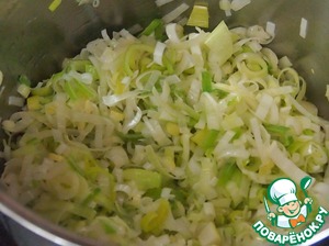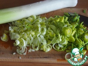 Крупный лук-порей нарезать тонко вместе с зелеными листьями. Немного колечек с белой части оставить для украшения супа.