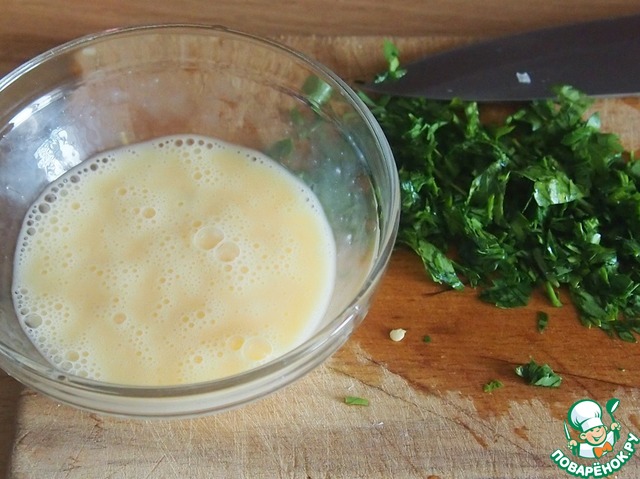 Тем временем вилкой взболтать яйцо с двумя ложками воды. Так яичные полосочки в супе становятся тоненькими и почти незаметными. Петрушку мелко порубить.
