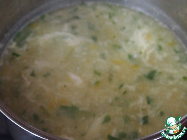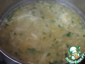 Вылить яйцо в суп, перемешать и варить минуту, чтобы яйцо сварилось. Добавить петрушку и как только суп снова закипит, сразу выключить огонь.