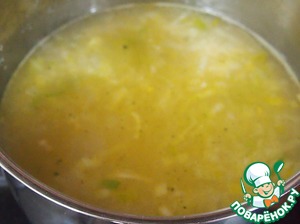 Если у вас имеется домашний бульон, это здорово! В противном случае можете, как я, использовать бульонные кубики. Ярые противники консервантов, не имеющие домашнего бульона, могут его приготовить отдельно или просто заменить водой. Вылить бульон в кастрюлю, перемешать, чтобы не образовались комочки. Варить до мягкости лука. В рецепте указано максимальное количество бульона, оно напрямую зависит от размера использованного лука-порея, поэтому к указанному в рецепте количеству подходите творчески.