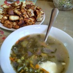Интересные щи со щавелем, соленым/маринованным /огурчиком и зеленым горошком! Да со сметанкой! Пикантные, легкие и нежные! Можем сварить на мясном бульоне, а можно и так, просто на воде...