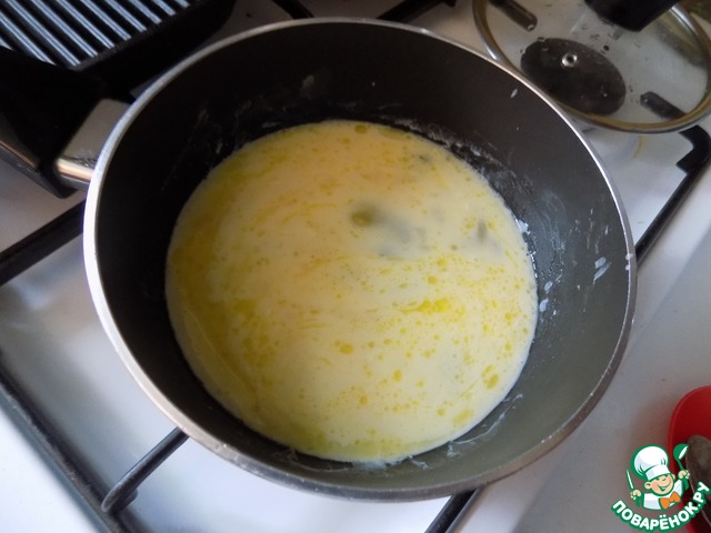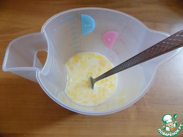 В посуду разбиваем яйца и наливаем молоко, кладём соль по вкусу. Яйца с молоком нужно просто аккуратно перемешать, не взбивая.
