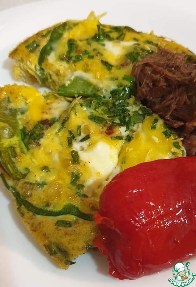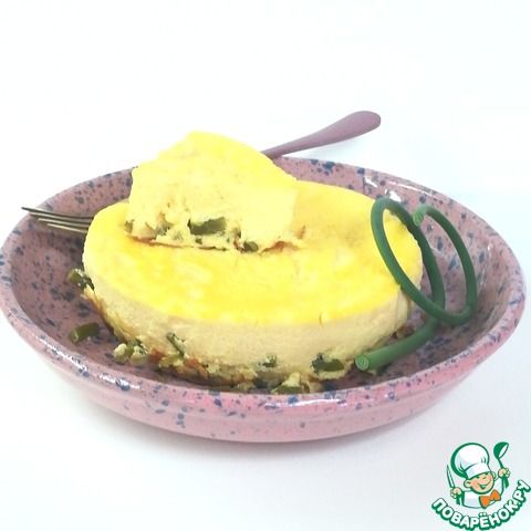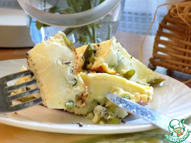 Готовим омлет до готовности. Это займёт минут 12-15 и будет видно, что он готов. Омлет хорошо поднимется под крышкой. Главное его не открывать пока он стоит на плите и почти полностью не схватится. Конечно, когда вы его будите выкладывать в тарелки, он немного осядет.
