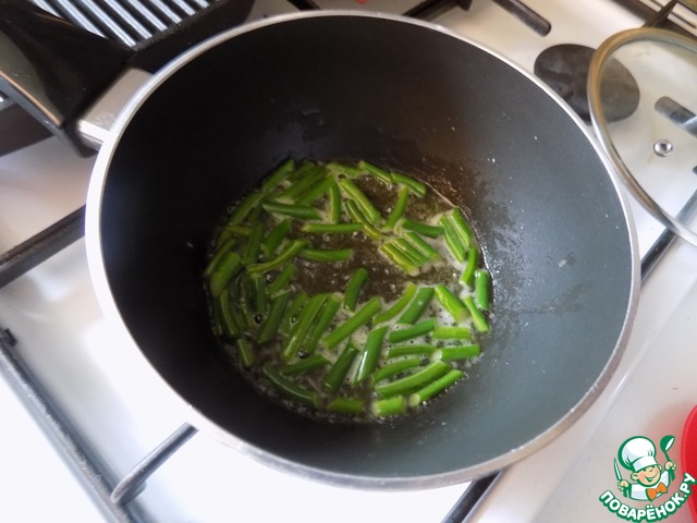 Выливаем смесь в сотейник к стрелкам и сразу перемешиваем. Убавляем огонь на минимум и накрываем крышкой.