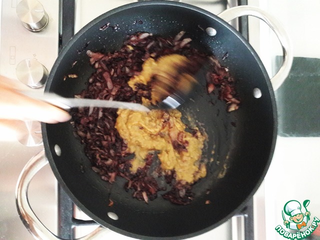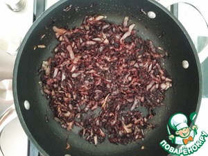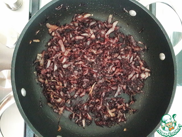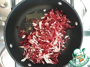 Обжарить салат до мягкости, затем добавить красное вино и выпарить.
