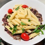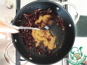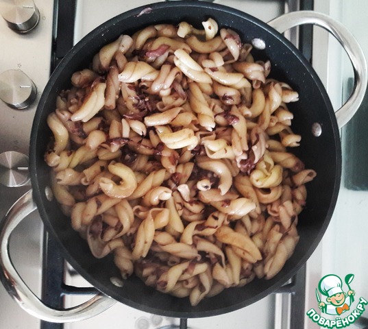 Пасту сварить в посоленной воде в течение указанного на упаковке времени. Или на 1 минуту меньше. Так полезнее. Отцеженную пасту выложить в сковороду и тщательно мешать, пока паста не приобретет равномерный фиолетовый оттенок.