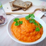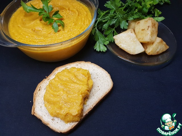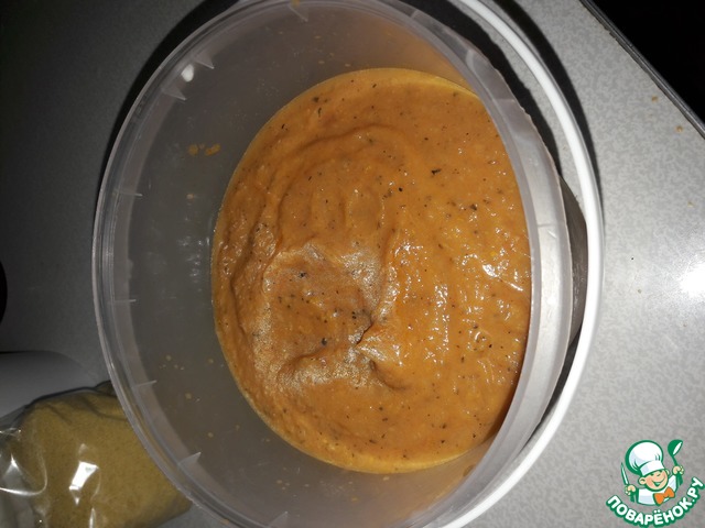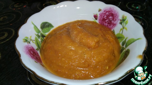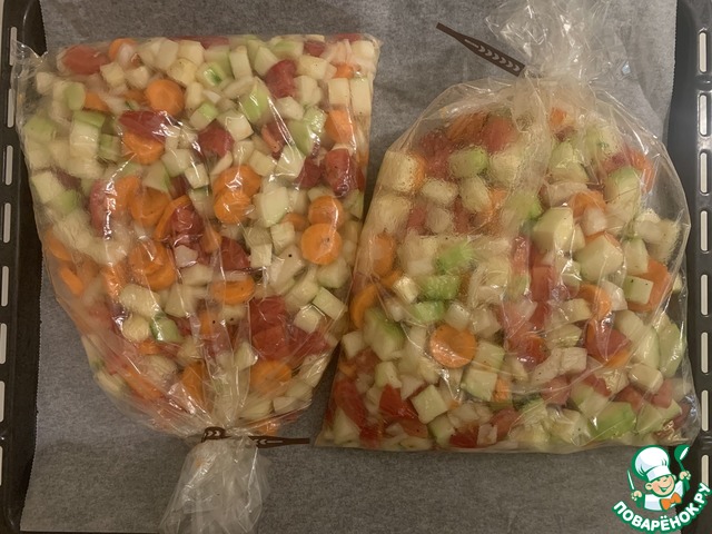 В пакет для запекания выложить наши овощи. Пакет завязать и тщательно встряхнуть, чтобы все специи равномерно распределились. Пакет выложить на противен, и сделать пару проколов в пакете. Отправить противень в духовку на 1,5 часа при 180 гр. Готовые овощи остудить и переложить в удобную посуду. Пюрировать овощи блендером. Готово!