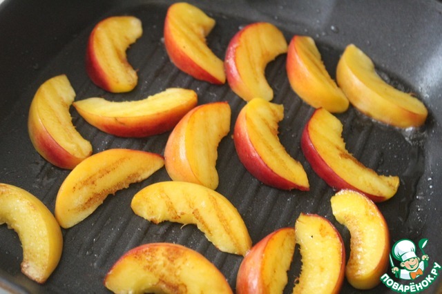Обжариваем на оливковом масле на сковороде гриль персики с двух сторон.