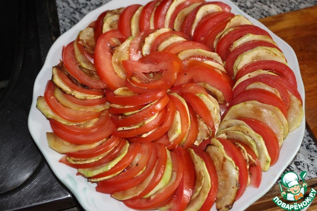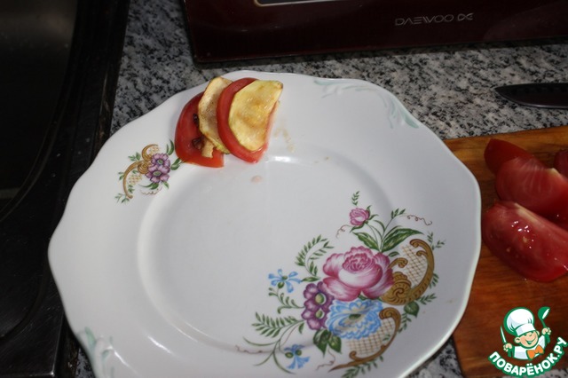 Полить заправкой помидоры с кабачками. -