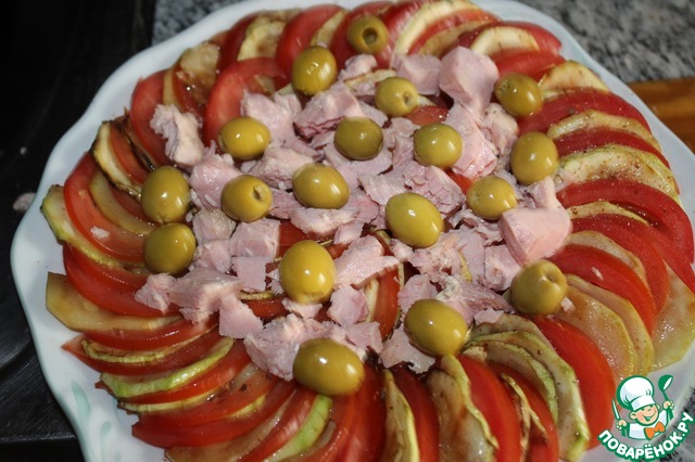 Выкладываем салат на тарелку. Кусочек помидора, кусочек кабачка и т. д. -