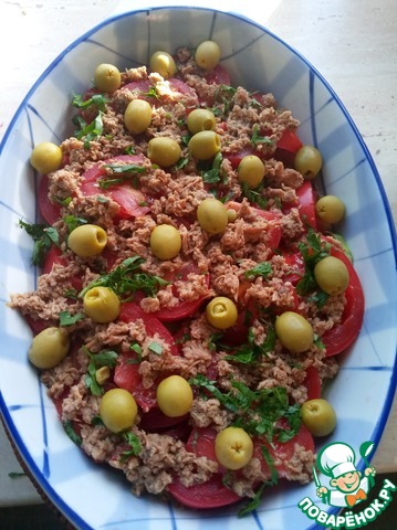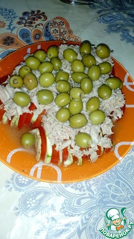Выложить на верх салата оливки и тунца небольшими кусочками.