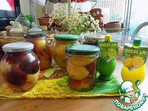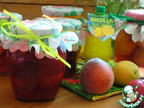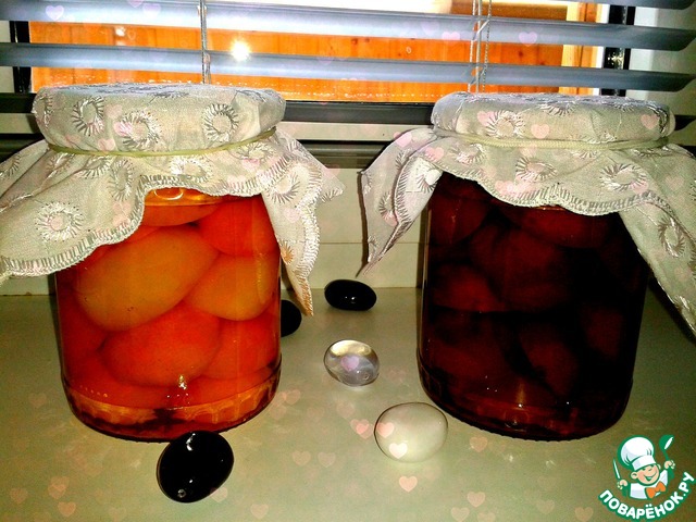 Я сделала одну банку персиков, одну банку абрикосов, одну банку крупной сливы и две банки ассорти из этих фруктов. Я сделала столько, чтобы показать наглядно, а так конечно я делаю побольше.