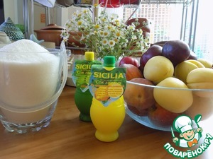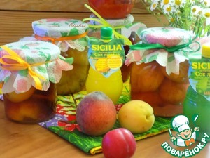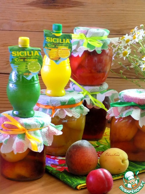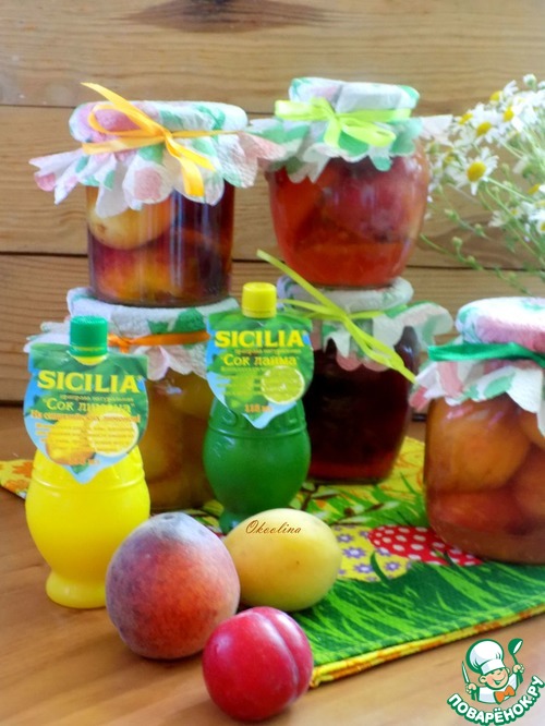 Заготавливаю фрукты в сиропе с лимонным или лаймовым соком такие, которые у нас не растут, а это: персики, крупная слива, абрикосы, нектарины, виноград тёмный, иногда грушу, но уже нашу мелкую и мелкие яблоки. Делаю по одной схеме и хочу сказать, что пользуюсь концентрированным соком SICILIA уже давно, как только его увидела в магазинах. Очень удобно, а раньше отжимала сок из лимона.