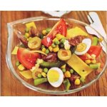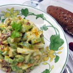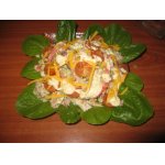 Хочу предложить очень вкусный и простой в приготовлении салат, состоящий всего из трёх ингредиентов и заправки. Салат хорош тем, что его можно приготовить заранее, от этого он становится ещё вкуснее, постояв в холодильнике, все составляющие пропитываются заправкой. Этот салат очень нравится моим родным и друзьям, когда я его готовлю, то он съедается в первую очередь.