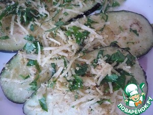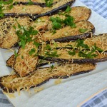 Переложить баклажаны на противень, застеленный бумагой для выпечки. Выложить оставшуюся панировку на каждый ломтик баклажана, при желании можно немного присыпать натертым сыром. Сбрызнуть немного маслом и запечь баклажаны в духовке при температуре 200 градусов, примерно 30 минут.