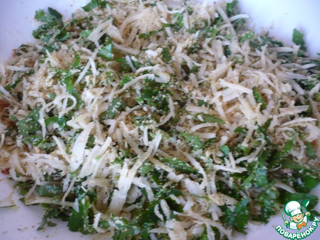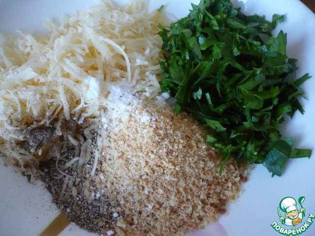 Теперь приготовим панировку для баклажанов: в миску высыпаем панировочные сухари, добавляем натертый на мелкой терке твердый сыр, соль, черный молотый перец и мелко нарезанную петрушку.