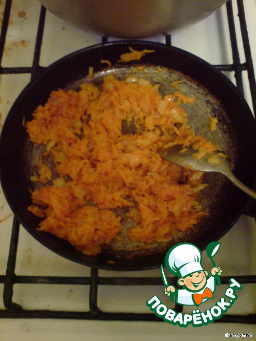 В это время возьмите маленькую сковороду. Положите маленький кусочек сливочного масла и капните немного растительного масла, нашинкуйте репчатый лук полукольцами и обжарьте до золотистого цвета, морковь потрите на терке и обжарьте с луком.